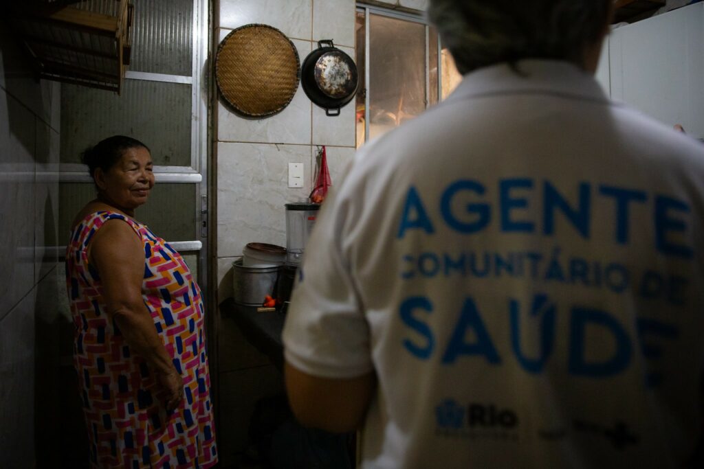 agentes comunitários de saúde que visitam casas todos os meses.